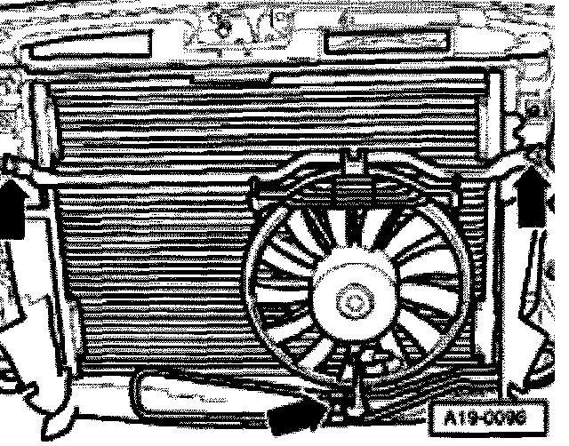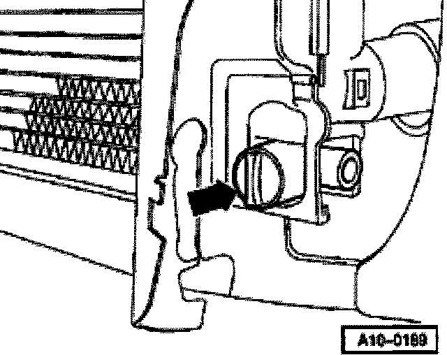 - Disengage retaining clips on connecting flanges -arrow- and pull coolant hoses off radiator.