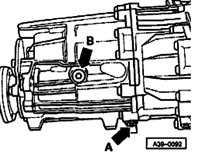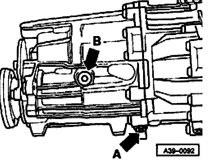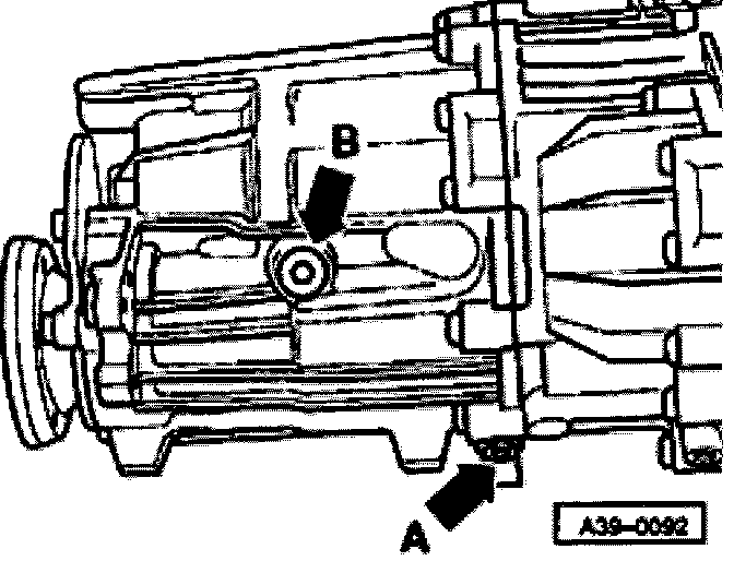 - Remove filler plug -arrow B-.