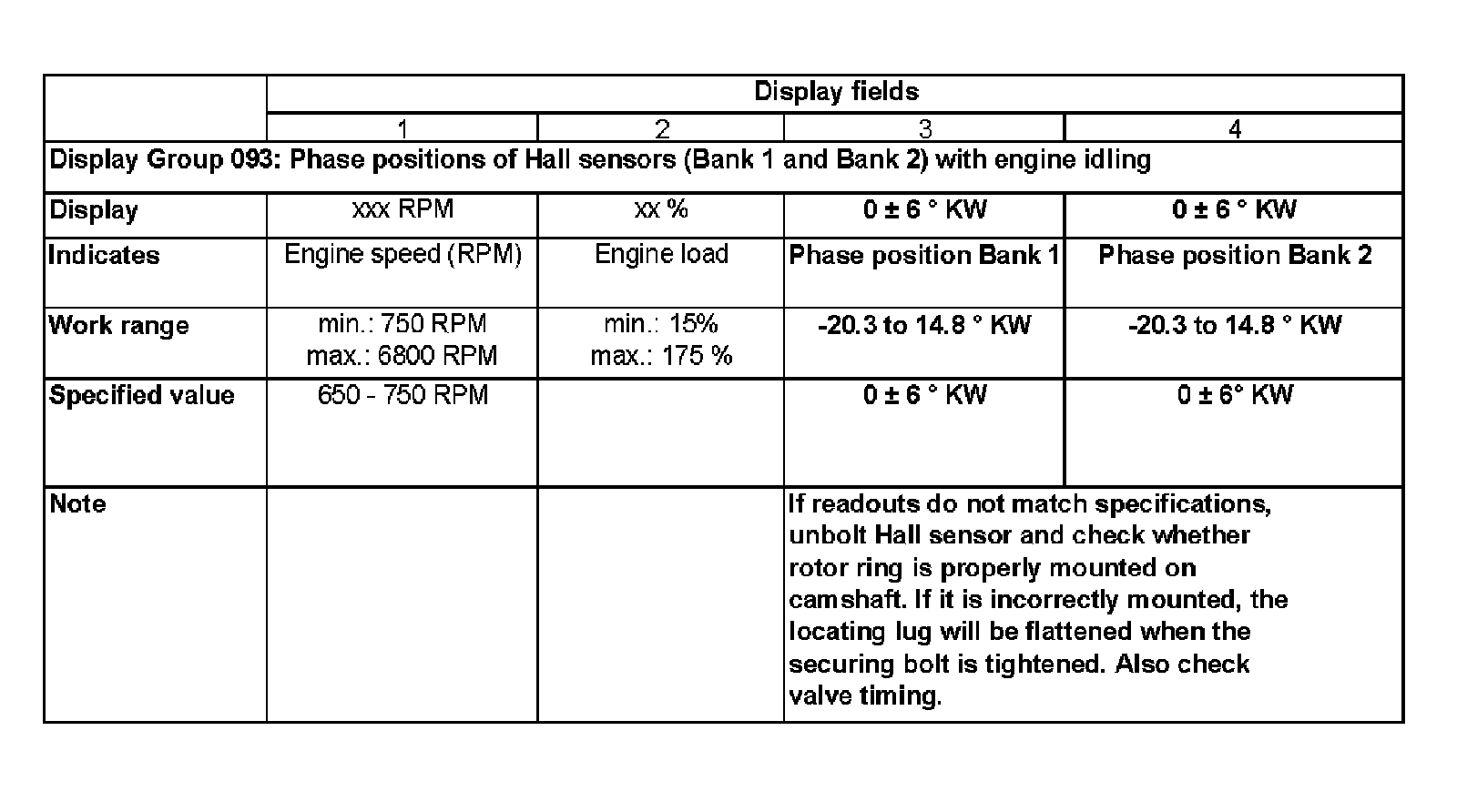 - Check specified display values for Hall sensors.