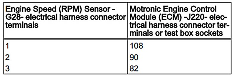 - Using a Multimeter, check the Engine Speed (RPM) Sensor - G28- electrical harness connector terminals to the Motronic Engine Control Module (ECM) -J220- electrical harness connector terminals for resistance.