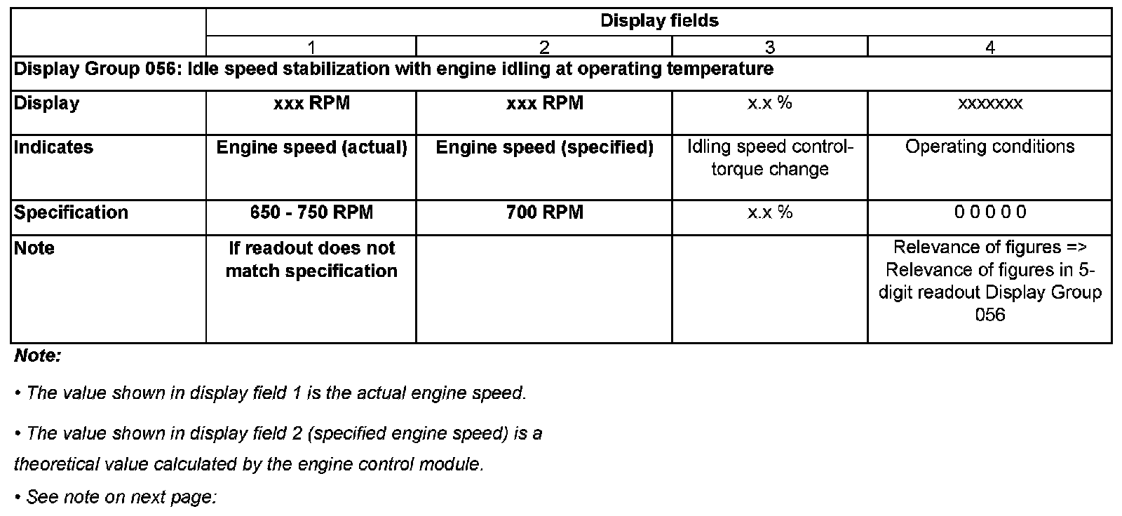 - Display fields 3 and 4 provide additional information which is not relevant when checking the idle speed.