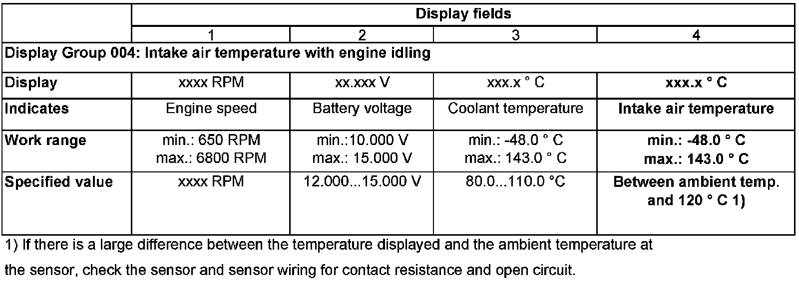 - Check display value for intake air temperature sensor (display field4):