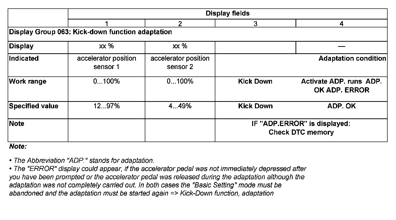 NOTE: During the kick-Down point adaptation the VAG1551 displays "Kick-Down ADP. runs". After the kick-Down point adaptation was successfully carried out the VAG1551 displays "kick-Down ADP. OK", now you can release the accelerator pedal.