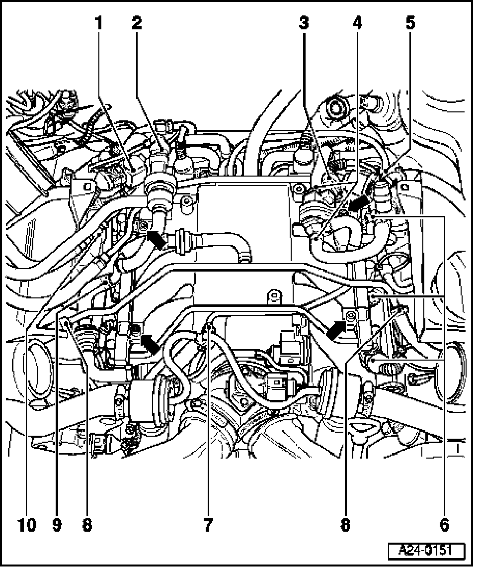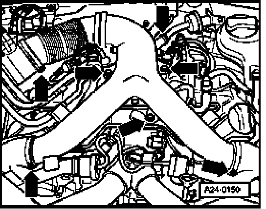 To reach the fuel rail (fuel distributor), several work steps are required which are described in the following for vehicles with manual transmission (without Secondary Air Injection - AIR-); there are only minor differences in the work procedure for vehicles with automatic transmission (with Secondary Air Injection -AIR-).