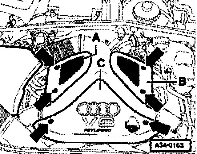 - Loosen bolts (arrows) and remove engine cover panels (arrows -A- through -C-).