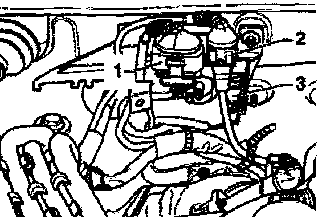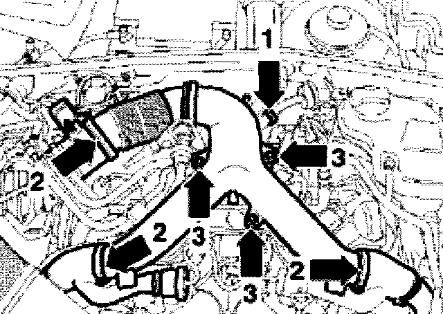 - Detach air intake duct. To do this, pull off retainer catch -1-, loosen clamps -2- and unscrew bolts -3-.