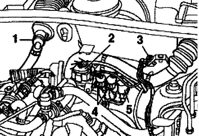 - Loosen clamp -3-, lift heat shield -2-slightly and unscrew remaining nuts -5-.