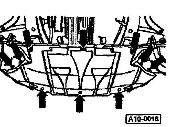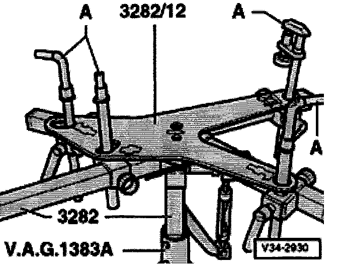 - Run transmission jack V.A.G 1383 A with transmission support 3282 in under the transmission and take up the weight of the transmission.