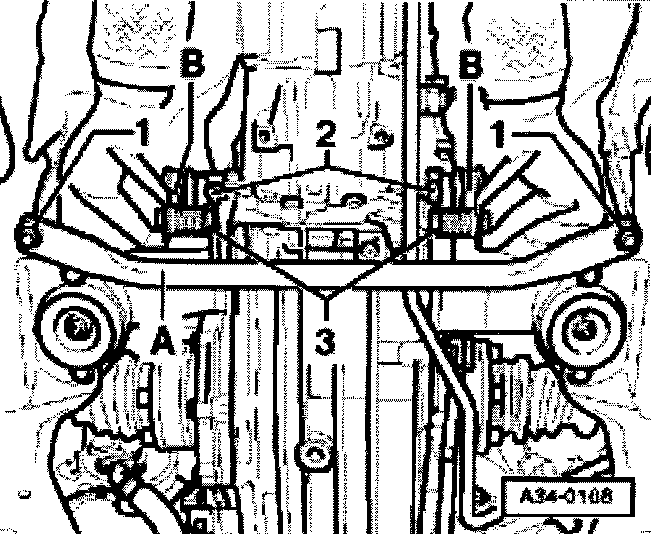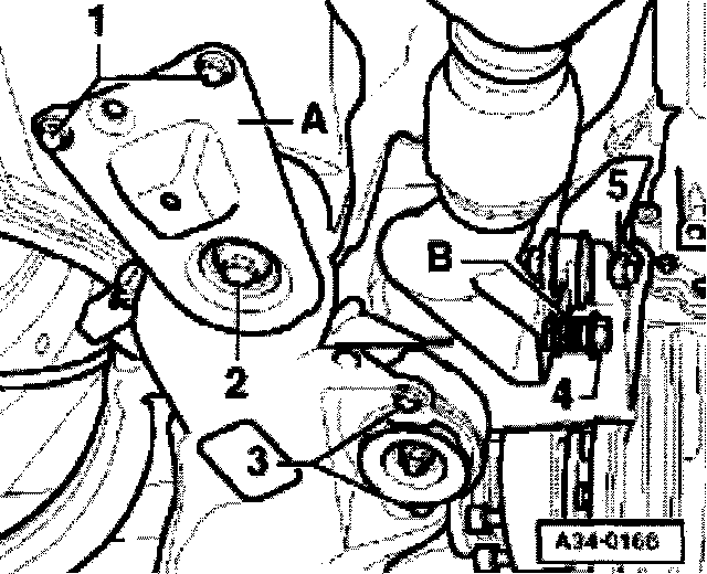- Unscrew and remove bolts -1- and -2- on right and left and remove support-A-.