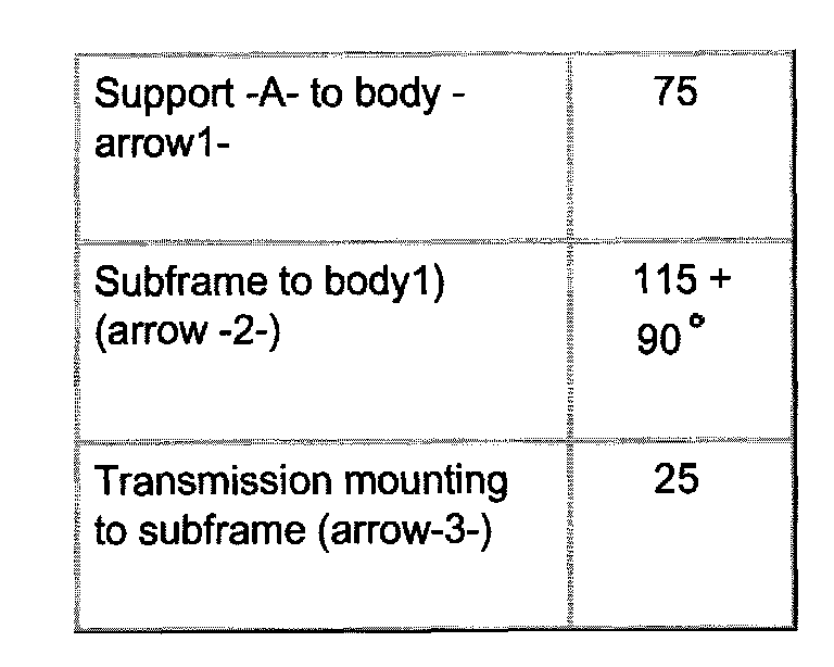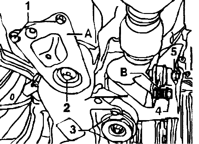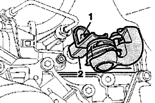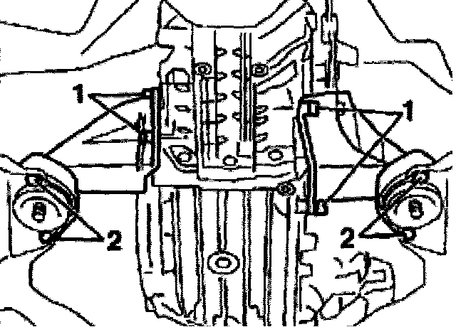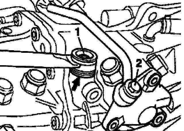 - Unscrew bolts -1- and -2- and remove right and left transmission supports from transmission and subframe together with bonded rubber mountings.