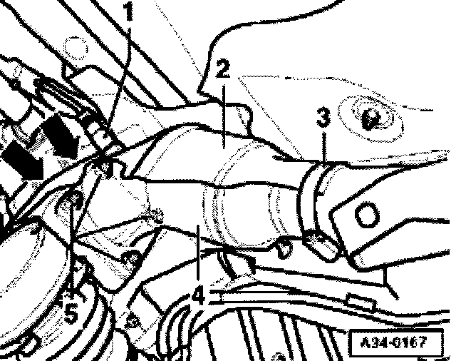 - Lift heat shield -2- and pull out front exhaust pipe together with catalytic converter -4-.