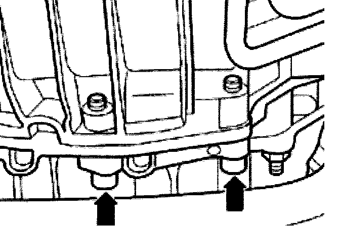 - The two hexagon socket head bolts M10 x 60 must be replaced by new hexagon bolts M10 x 55 (Part No. N104684 01) so that the two bolts (arrows) can be tightened with a torque wrench after installing the transmission.