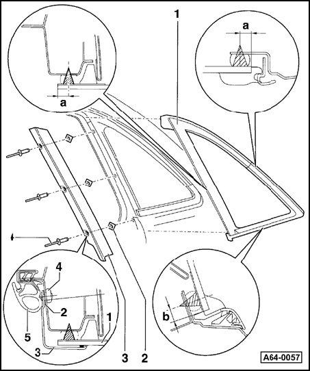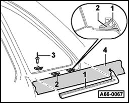 - Carefully remove roof trim strip - 1 - from securing clips using plastic wedge, starting from bottom.