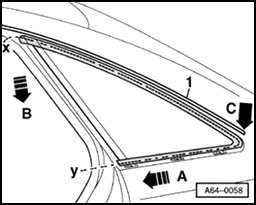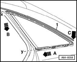 - Pull cutting cord in direction of arrow - A - using light sawing action, and cut through adhesive sealing material below at side panel and above at roof frame.
