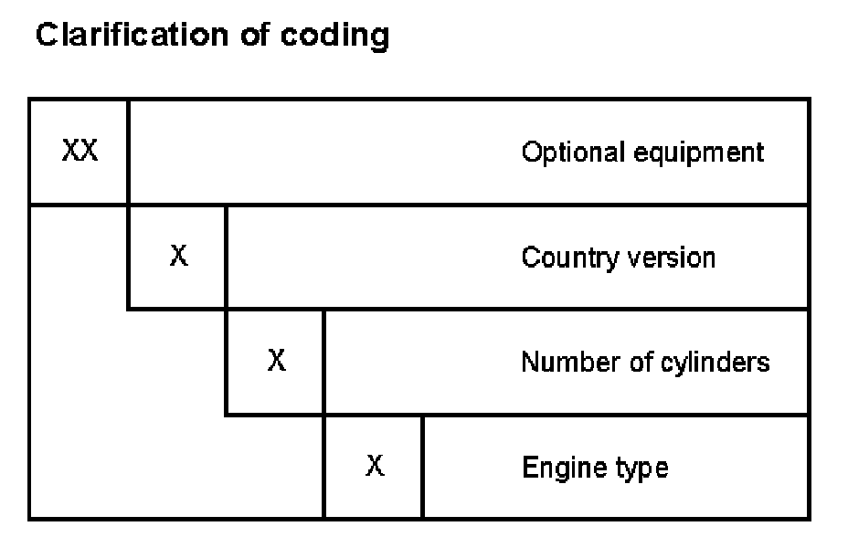 Example: Larger fuel tank volume (82 instead of 70 liters) and seat belt warning active 01 + 02 = 03