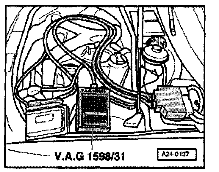 - Connect VAG1598/31 test box to wiring harness for engine control module. Do not connect to the engine control module itself. Refer to "Scan Tool Testing/Scan Tool Connecting and Initial Checks/Connecting VAG1598/31 Test Box" Testing and Inspection