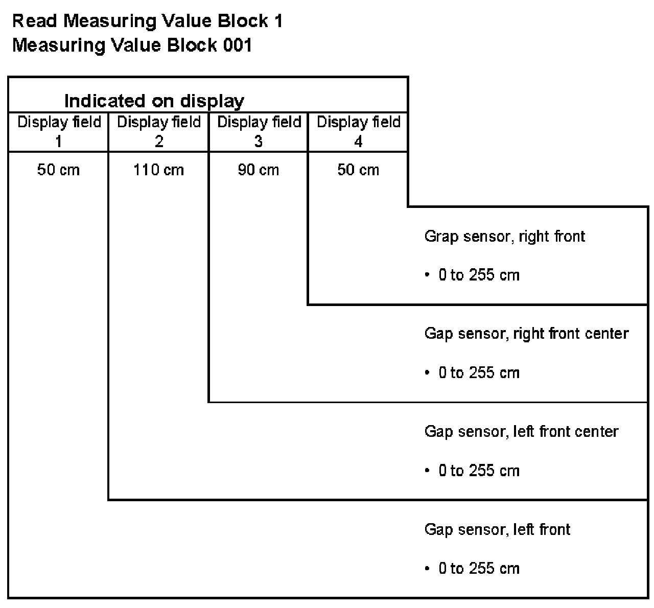 001 1 = Gap, sensor at left front, cm