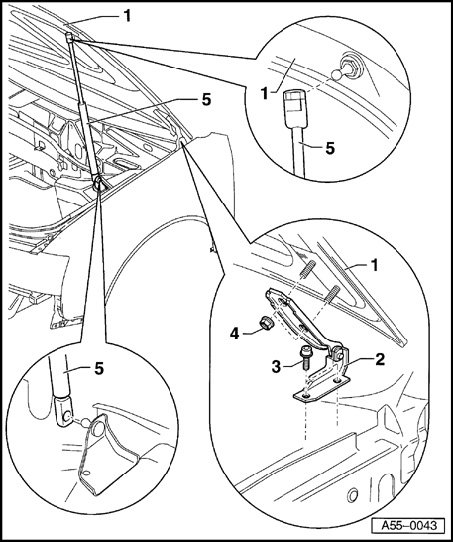 - Remove gas-filled strut - 5 - from hood - 1 - Fig.1.