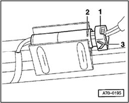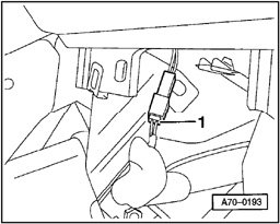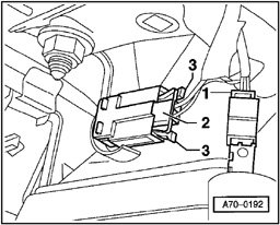 - Use screwdriver to lift connector - 1 - for passenger side airbag unit over retainer tab - 2 - and pull off connector in direction of arrow - 3 -.