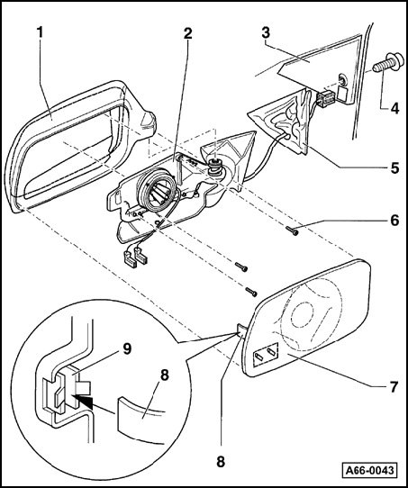 - To remove, pry off mirror glass, disconnect harness connectors for mirror heater, unscrew Phillips-head screws - 6 - and remove mirror adjustment unit from mirror housing - 1 -.