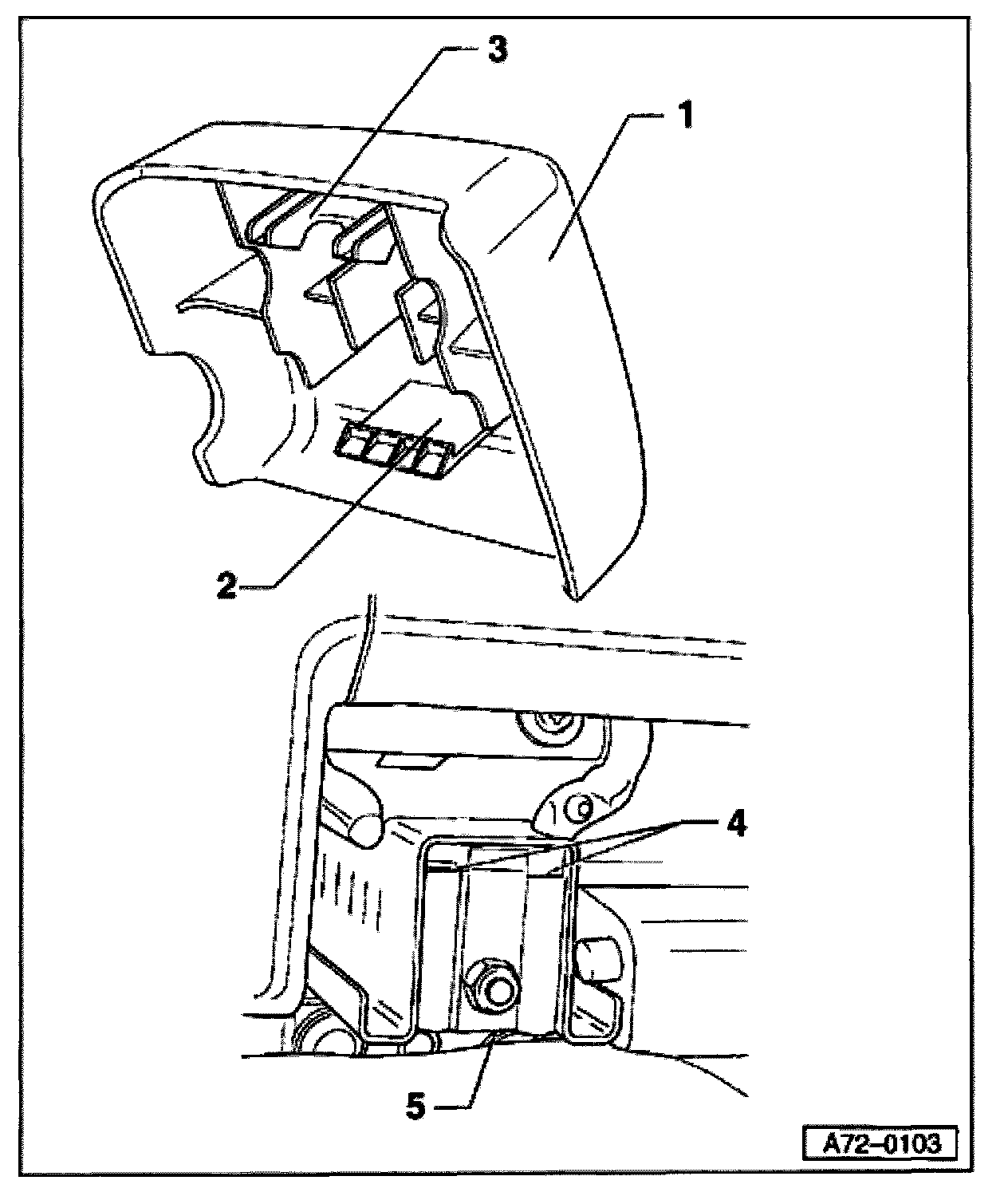 - Engage retaining tab -2- on front seat rail front-cover -1- at mount -5-.