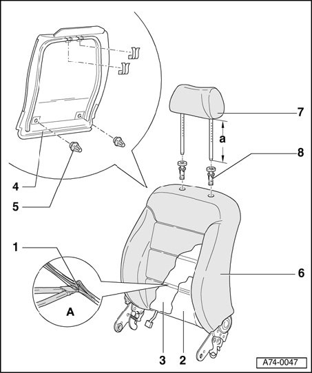 - Insert upholstery needle or screwdriver - 3 - with maximum width of 2 mm into hole - 4 - (opposite retaining clip for head restraint guide).