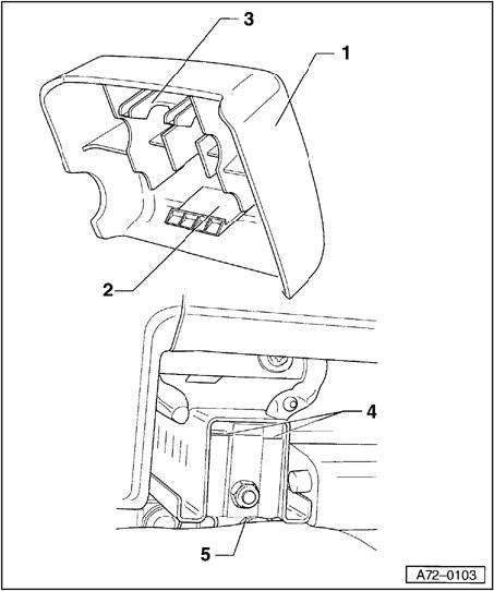 - Pull front seat rail front-cover - 1 - upward slightly so that retaining tabs - 3 - can be released from mount - 4 -.