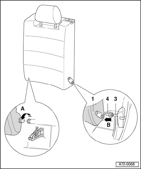 - Lift backrest - 1 - out of center support bracket - 2 -, - arrow A - and pull off fitting - 3 -, - arrow B -.