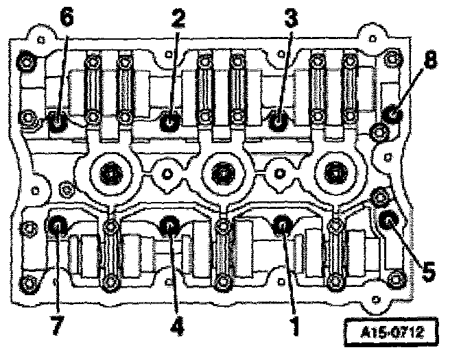 - Tighten cylinder head bolts in depicted sequence in two stages as follows: