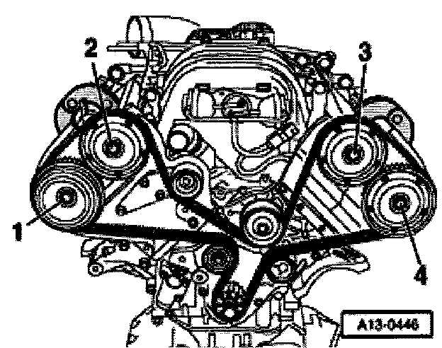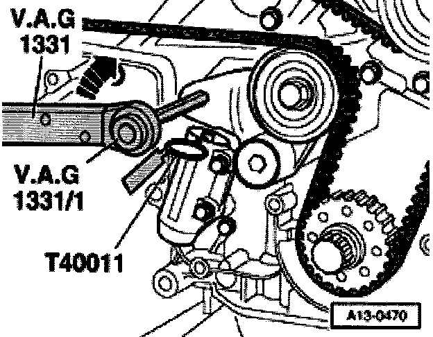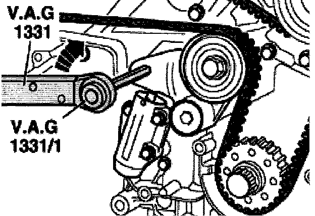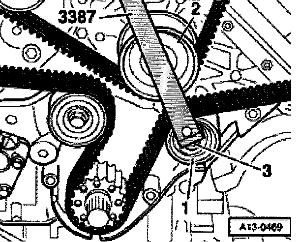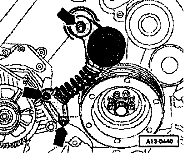 ^ The toothed belt tensioner is oil-dampened. Compress it by slowly applying constant pressure.