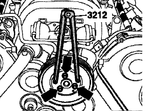 - Remove ribbed belt gear of vane pump (arrows) using 3212 spanner wrench as retainer.