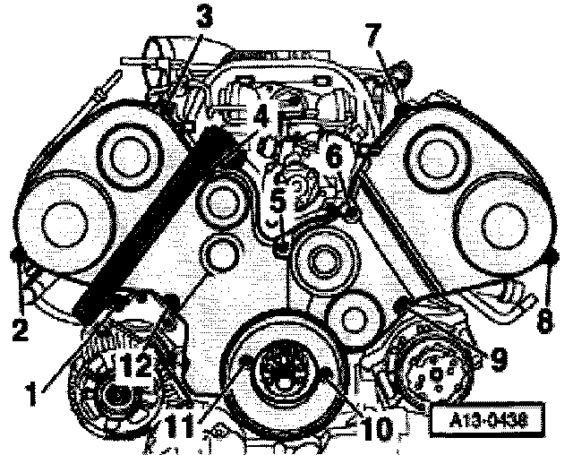 - Unscrew bolts -1 to 12- and remove toothed belt guards.