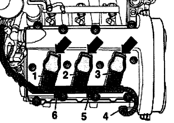 - Unscrew bolts -4- and -5- at left cylinder head cover.