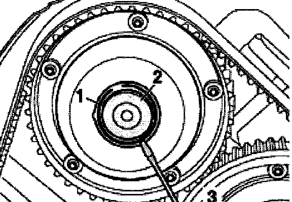 - Using 3387 pin wrench, turn eccentric pulley -1- in clockwise direction until the handle of the pin wrench is exactly above the center axle of coolant pump gear -2-.