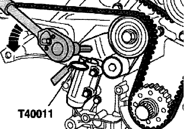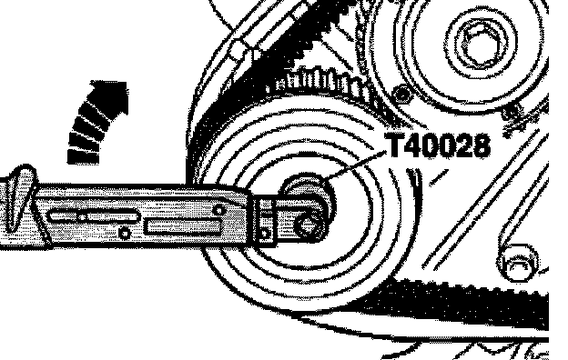 - Using 8 mm socket head wrench, turn toothed belt tensioning roller in direction of arrow until T40011 pin can pulled out.