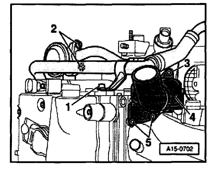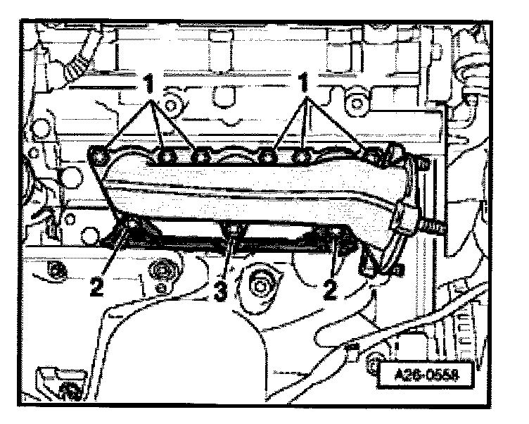 - Unscrew threaded connection -1- of exhaust manifold which is accessible from top.