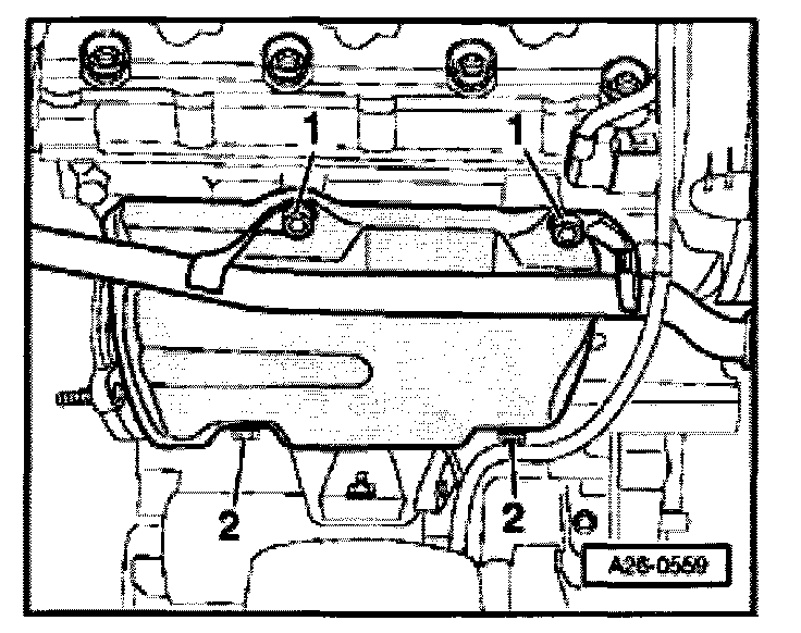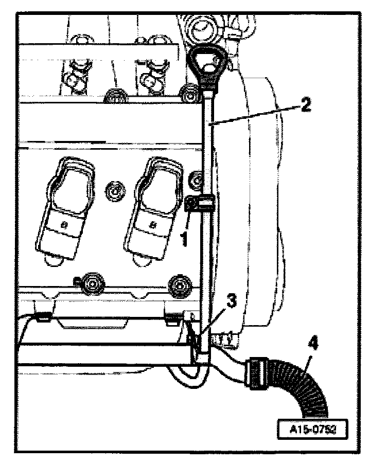 - Pull out guide tube for oil dipstick -2- toward top from the oil pan (upper part) and swing it forward.