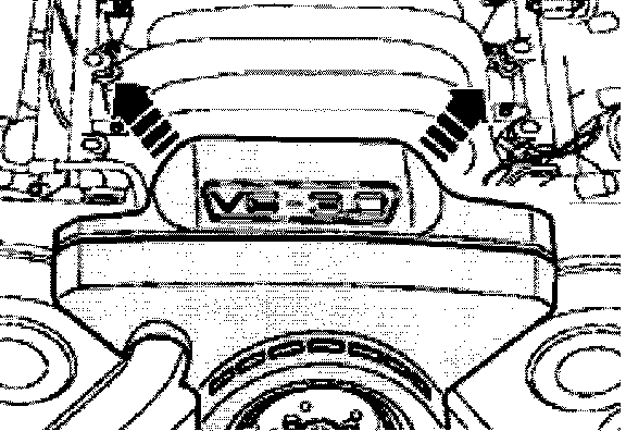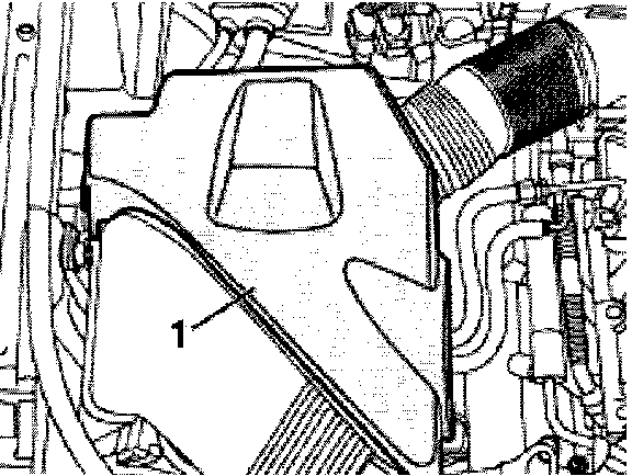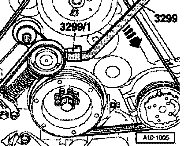 - Swing ribbed belt tensioner in direction of arrow to release tension on ribbed belt using 3299 ribbed belt installation tool and 3299/1 claw for tensioner.