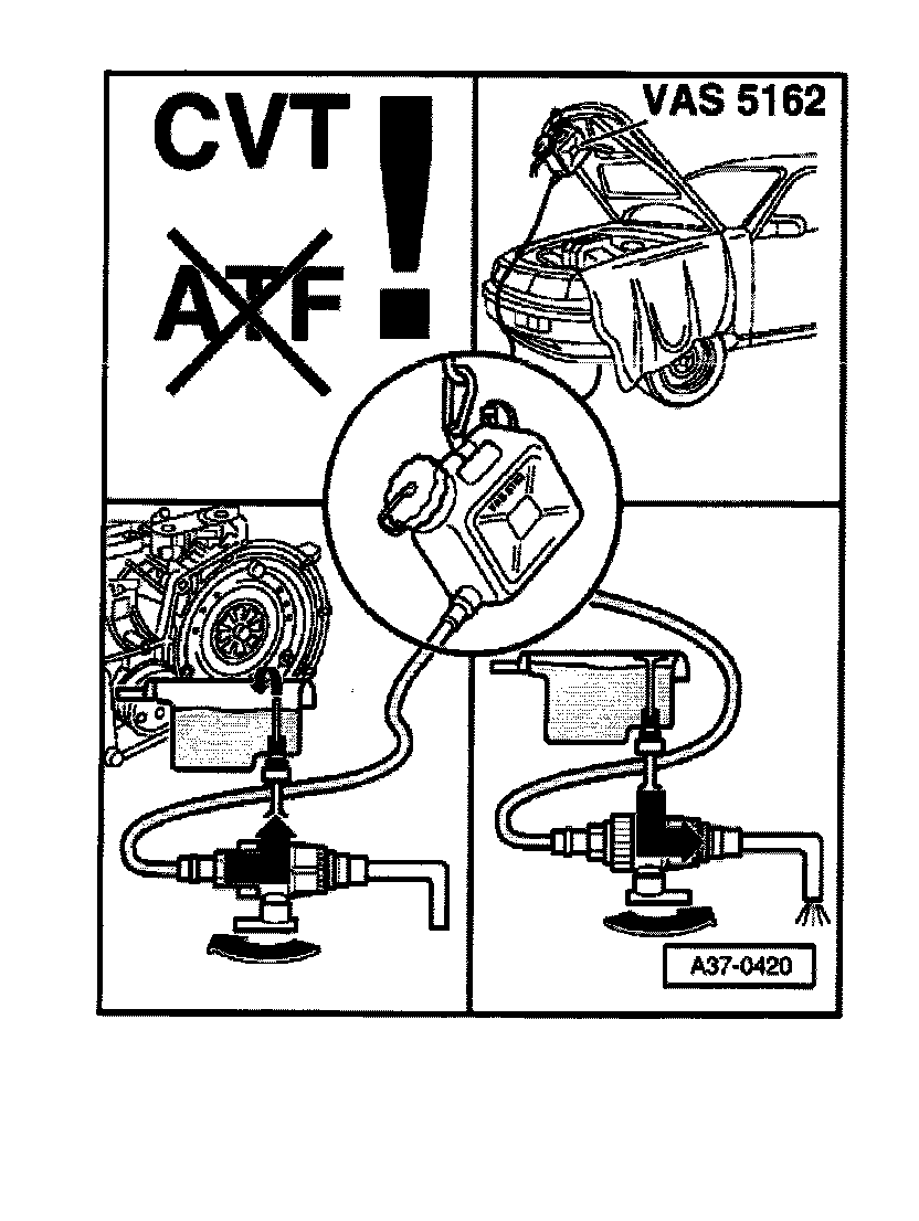 - The top left illustration on the reservoir of the filling device VAS 5162 indicates that only special ATF can be used for the CVT transmission.