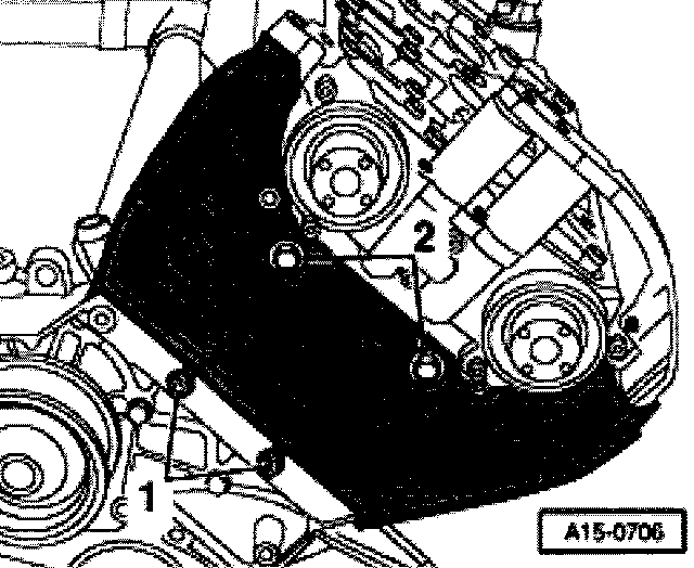 - Unscrew bolts -1- and -2- and remove toothed belt guard at rear left.