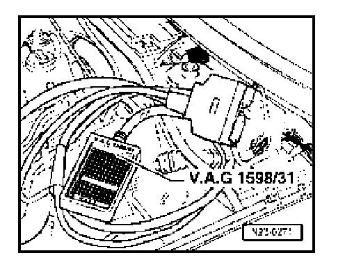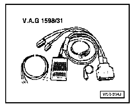 - Connect e.g. VAG1598/31 test box to connectors of wiring harness. Connect Ground (GND) clip at test box (not visible in illustration) to Ground (GND). Relevant test procedures note whether Engine Control Module (ECM) should also be connected to the test box.