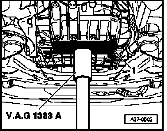 - Remove VAG1359/2 universal mount from VAG1383A engine/gearbox jack and place a piece of wood -1- onto punch instead.