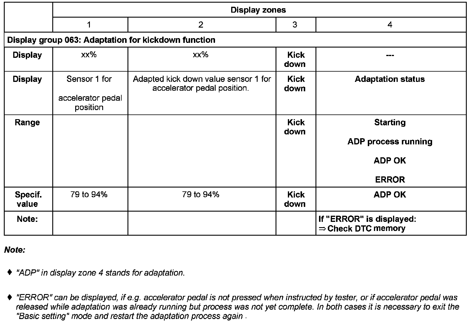NOTE: During the kickdown point adaptation process, "Kickdown ADP running" is shown on the display. After successful adaptation of the kickdown point "Kickdown ADP OK" appears on the display.