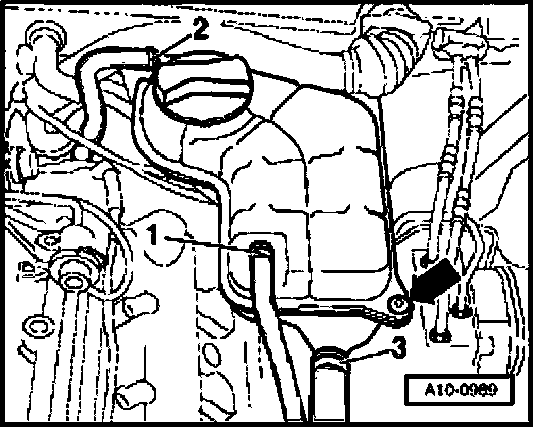 - Lay coolant expansion tank with connected coolant hoses -1 to 3- aside.
