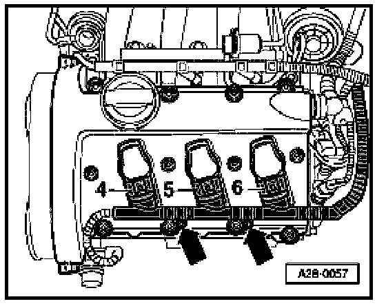 - Remove bolts (arrows) on right cylinder head.