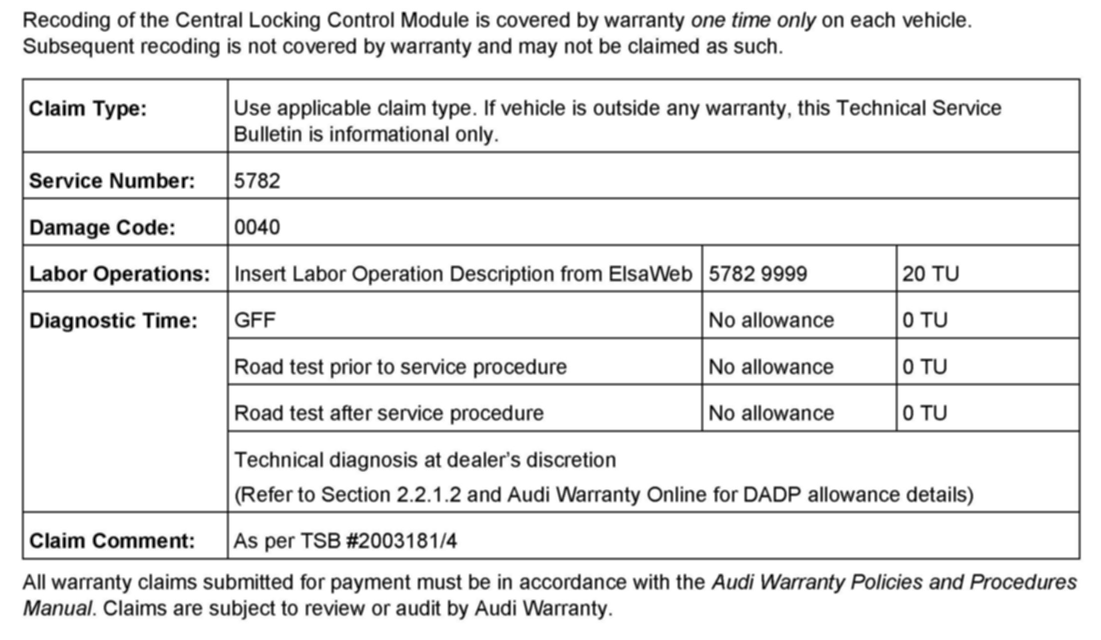 Review optional control module coding below with customer to confirm the desired function changes. Input codings into central locking control module using function 07 Code Control Module.