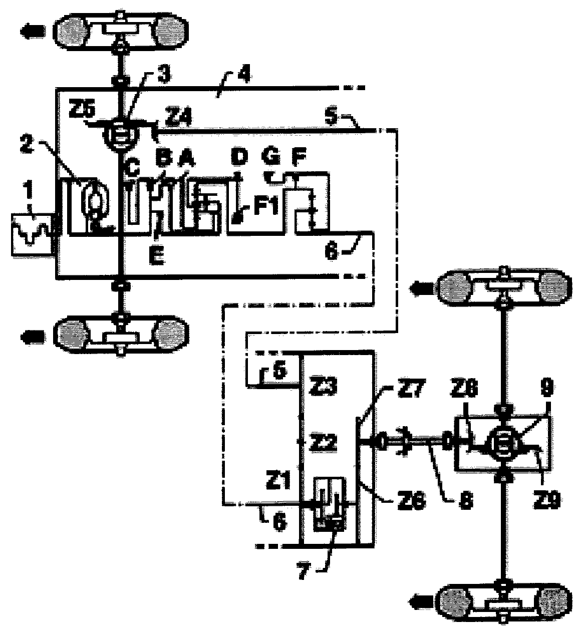 Z6, Z7 = spur gears of rear intermediate drive