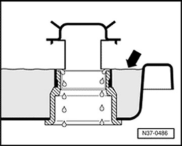 Guide filler hook of ATF filler tool V.A.G 1924 into an opening -arrow- of protective cap, while doing so, do not push cap up and in.