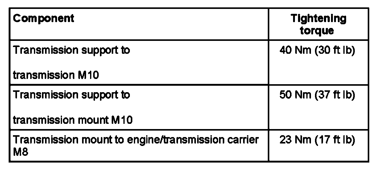 Transmission mount to engine/transmission carrier M8 23 Nm (17 ft. lbs.)