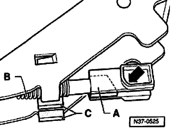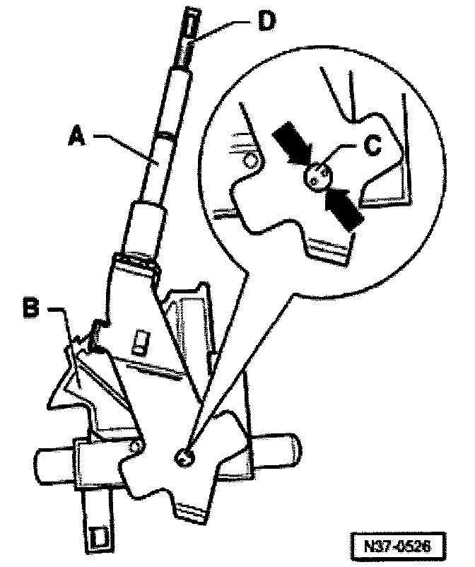 - With lifted pull rod -D-, insert guide -B- with Tiptronic spring into selector lever-A-.